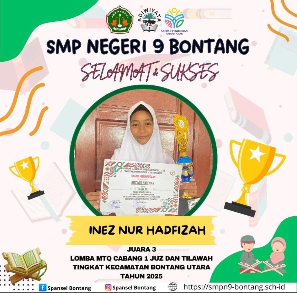 Kepala SMPN 9 Bontang, Lilyn Indriyawati, mengatakan bahwa keberhasilan siswi kelas 8D, Inez Nur Hadfizah, meraih Juara 3 MTQ Cabang 1 Juz dan Tilawah pada MTQH ke-19 Tingkat Kecamatan Bontang Utara, menjadi bukti nyata hasil pembinaan tersebut.